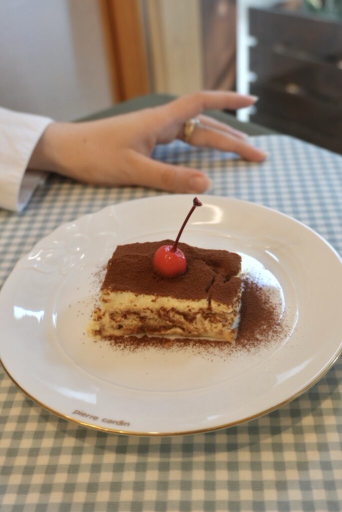 ティラミスにはさくらんぼがちょこんと乗っていて見た目にもかわいらしく、苦さ控えめで誰でも食べやすい仕上がり。